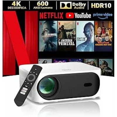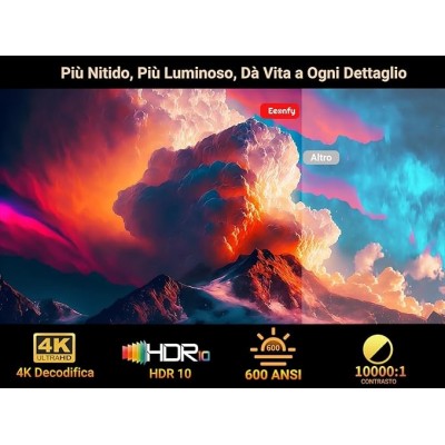 【HDR10 e Decodifica 4K】 Dotato della tecnologia HDR10, il proiettore 4K home cinema migliora il contrasto e la precisione dei colori, rendendo le scene luminose ancora più brillanti e quelle scure più profonde, ottenendo un eccezionale intervallo dinamico. Con una risoluzione nativa 1080P e 600 lumen ANSI, proiettore portatile offre chiarezza HD, mentre la decodifica 4K fornisce maggiori dettagli e nitidezza, ideale per film, giochi e un'esperienza visiva migliorata.