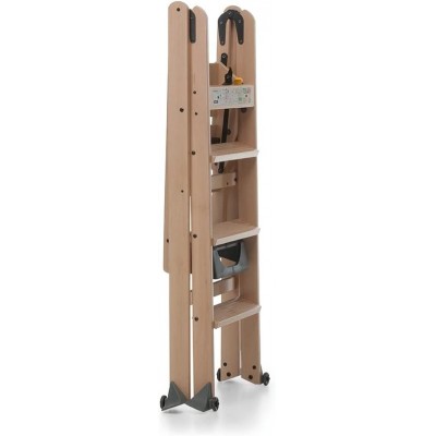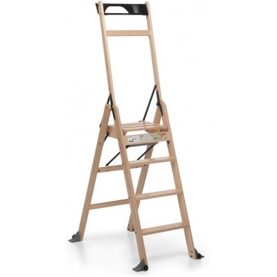 • Escalera plegable de 4 pasos con barreras protectoras y una gran plataforma, hecha de madera de haya pintada masiva. Cumple con la legislación europea en 131